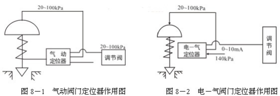 調(diào)節(jié)閥定位器是調(diào)節(jié)閥的主要附件,它與氣動調(diào)節(jié)閥配套使用,接受調(diào)節(jié)器的輸出信號,然后以它的輸出信號去控制調(diào)節(jié)閥,當(dāng)調(diào)節(jié)閥動作后,閥桿的位移又通過機(jī)械裝置反饋到閥門定位器,因此,這種定位器和調(diào)節(jié)閥組成一個(gè)閉環(huán)回路,如圖8-1和圖8-2所示。