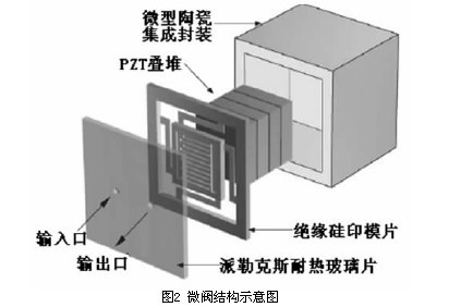 圖2所示是美國研制的應(yīng)用于低溫試驗(yàn)的壓電微型閥的結(jié)構(gòu)簡圖。此壓電微閥的主體由一塊絕緣硅印模片和作為致動器的壓電陶瓷疊堆組成。PZT堆疊驅(qū)動絕緣硅印模片,從而改變與輸入輸出口所在的派勒克斯耐熱玻璃片之間距離而完成對流量的控制。在其外部有一塊尺寸為1×1×1cm3的微型集成陶瓷封裝,它所具有的零孔隙量能保證在真空環(huán)境里沒有泄漏,并且與環(huán)氧樹脂相結(jié)合能給整個閥提供一個完全密封的環(huán)境。該閥的特點(diǎn)之一在于在絕緣硅印模片朝向耐熱玻璃片的一面刻印了許多50μm寬、120μm深、周長為127mm的蛇形凹槽,增加了有效的通流面積,即增加了可提供的流量范圍。并且在具有凹槽的方形硅片的四個方向使用了4條彎曲的蟹型腿做為支撐,保證了有效的支撐和硅片的壓電制動器的驅(qū)動下的靈活運(yùn)動。實(shí)驗(yàn)中,在室溫時該壓電微閥的調(diào)節(jié)能力范圍能高出同尺寸閥的幾個數(shù)量級;當(dāng)溫度為80K或380K時,輸入壓力高于大氣壓104kPa的情況下,能成功的將流量從380mL/min調(diào)節(jié)到20mL/min。并且在工作過程中功率消耗小,響應(yīng)時間小于1ms,頻率寬度可達(dá)820kHz。達(dá)到了通過對冷卻劑的流量控制,使系統(tǒng)在分布式冷卻過程中達(dá)到較高的溫度穩(wěn)定性和較小的溫度梯度。
