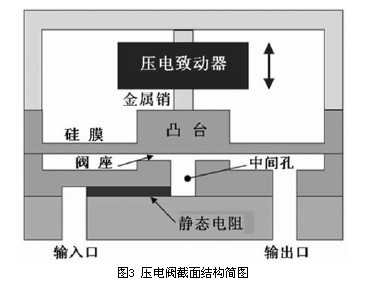 圖3所示是荷蘭特文特大學(xué)開發(fā)的一種用于調(diào)節(jié)氣體流量的常閉式壓電閥。它通過由金屬銷串接起來的壓電致動器驅(qū)動凸臺周圍的硅膜的偏斜來控制閥的流量。閥座和中間孔的一層是由硅材料做成的可變電阻層,而在其下方還含有一塊形為方格形渠道的靜態(tài)電阻層。氣體從輸入口進(jìn)入方格形渠道,再通過中間孔到達(dá)閥座,在閥座上層的環(huán)繞于凸臺周圍的硅膜偏斜大小的控制下來改變氣體流量。圖4顯示了該閥使用可變電阻與靜態(tài)電阻相結(jié)合的方法實(shí)現(xiàn)了對流量的精確控制。實(shí)驗(yàn)空氣流量測試顯示,該壓電閥在壓力差為4bar的情況下,流量可以達(dá)到250mL/min。在閥門操作的任何階段都可獲得連續(xù)可控的氣體流量,整個過程中幾乎沒有滯后現(xiàn)象出現(xiàn),并且功率消耗也很低。