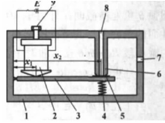 1-閥體;2-壓電堆驅(qū)動器;3-柔性鉸鏈擋板;4-壓力彈簧;5-密封薄片;6-進(jìn)氣噴嘴;7-出氣口;8-進(jìn)氣口;9-微調(diào)