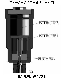國內(nèi)對噴嘴擋板式壓電閥進(jìn)行了較多的研究,圖7是一種噴嘴擋板式氣體壓電閥,它針對其中的柔性鉸鏈擋板進(jìn)行了設(shè)計和動力學(xué)分析,并經(jīng)過實(shí)驗(yàn)證實(shí),該壓電閥響應(yīng)時間為10ms的較快響應(yīng)速度,并且其允許工作壓力和輸出流量都較大,解決了當(dāng)前氣體壓電閥普遍存在的工作壓力低、輸出流量小的問題。