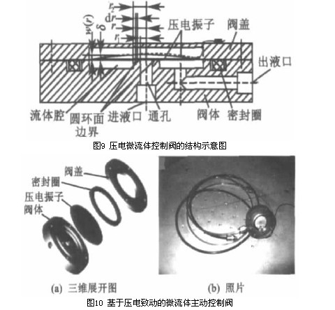 圖9和圖10是重慶大學(xué)在2008年提出的一種采用圓盤型壓電振子作為致動元件的微流體主動控制閥,它通過控制圓盤形的壓電致動元件來改變與其周邊的過流間隙,實(shí)現(xiàn)對微量流體的控制。實(shí)驗(yàn)結(jié)果表明該微流體主動控制閥可以實(shí)現(xiàn)對流量的連續(xù)控制,在壓電致動元件控制電壓一定的條件下,可以使閥的流量與進(jìn)出口壓差呈現(xiàn)一定的關(guān)系。