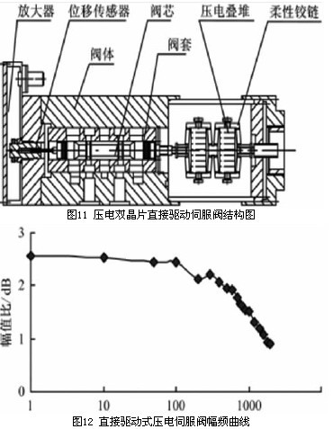 圖11是吉林大學(xué)研制的一種由壓電陶瓷直接驅(qū)動的伺服閥。研制者針對其柔性鉸鏈進(jìn)行了有限元分析,并測試了這種伺服閥的幅頻特性,(如圖12所示),頻寬為650Hz,靜態(tài)特性在閉環(huán)控制下為滯環(huán)小于1%,分辨率小于0.03%,抗污染能力強(qiáng)。另外,由于用PZT材料的逆壓電器件代替力矩馬達(dá),所以響應(yīng)時間非常短;替代了電磁元件,對外界不產(chǎn)生電磁干擾;位移輸出極高,可以完全滿足現(xiàn)代精密高速控制系統(tǒng)的需要。