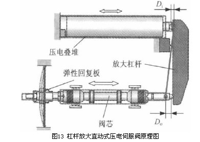 放大原理的直動式壓電伺服閥。杠桿式的位移放大機(jī)構(gòu)位于整個閥體和其上方的壓電疊堆的同側(cè),使它們的運(yùn)動方向平行,也同時使閥體的結(jié)構(gòu)較為緊湊。當(dāng)壓電疊堆伸長使輸入位移為Di時,通過柔性鉸鏈放大杠桿放大到輸出端,位移變?yōu)镈0傳遞至閥芯,再推動彈性回復(fù)板實(shí)現(xiàn)滑閥的移動。在壓電疊堆剛性滿足動態(tài)性能要求的條件下,系統(tǒng)的動態(tài)性能的高低取決于彈性回復(fù)板的剛度,剛度越高,系統(tǒng)響應(yīng)的建立時間越短,其響應(yīng)速度越快。