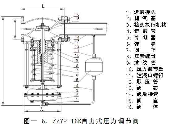 調(diào)壓閥主要由檢測執(zhí)行機(jī)構(gòu)、調(diào)節(jié)閥、冷凝器與閥后接管等四部分組成,其結(jié)構(gòu)詳見圖一。