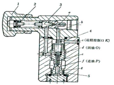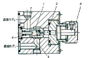 1-調(diào)節(jié)手柄 2-調(diào)壓彈簧 3-先導閥芯 4-復位彈簧 5-主閥芯