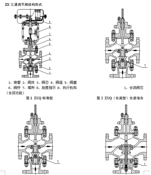 ZXX-16C型氣動(dòng)薄膜帶波紋管三通調(diào)節(jié)閥采用賀筒型薄壁窗口形閥芯結(jié)構(gòu),不同于柱塞形閥芯的襯套導(dǎo)向。配用多彈簧執(zhí)行機(jī)構(gòu),具有結(jié)構(gòu)緊湊、重量輕、體積小、拆裝方便等優(yōu)點(diǎn)。廣泛應(yīng)用于精確控制氣體、液體等介質(zhì),工藝參數(shù)如壓力、流量、溫度、液位保持在給定值。適合于把一種流體通過三通閥分成二路流出或是把兩種流體經(jīng)三通閥合并成一種流體的場(chǎng)合。