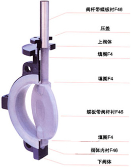 1.其基本類型有兩種,即D71F4和D71F46(中線)全襯里型對夾式蝶閥,采用對分兩片閥體組合,閥座與閥體內(nèi)襯一體化,閥門工作時(shí),只有全塑閥座與襯塑蝶板與介質(zhì)接觸,產(chǎn)品可承受“除熔融堿金屬和元素氟”外的任何介質(zhì)腐蝕,其中D71F46閥桿與蝶板(鍛)為一體,表面均勻包覆一層FEP。閥體通道內(nèi)表面光滑,流體阻力小,CV值高,流通能力強(qiáng),扭矩適中,采用四級(jí)密封結(jié)構(gòu)并在密封面外配以耐溫抗老化的SI橡膠的彈性襯墊閥座,完全達(dá)到介質(zhì)的零泄漏。