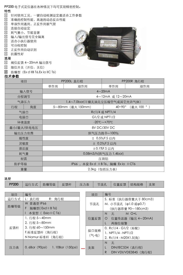 一、PP200電子式定位器產品描述: PP200系列包括PP200R(角行程)定位器和PP200L(直行程)定位器。PP200系列電子式閥門定位器是通過接受控制系統發出的4~20mA電流信號,控制閥門開度的裝置。采用壓電微型閥,具有優異的應答性能,給用戶提供了簡便快捷的設定環境。二、PP200電子式定位器特點針對使用工況,一鍵自動檢測準確的控制性能,高速應性能單雙作用通用,正反作用據氣管連接自動設定耗氣量小,節能顯著輸入/輸出信號完全隔離適合小執行器使用可分程控制正反作用自動識別抗震性好閥位反饋4~20mA輸出信號限位開關(開位、關位)