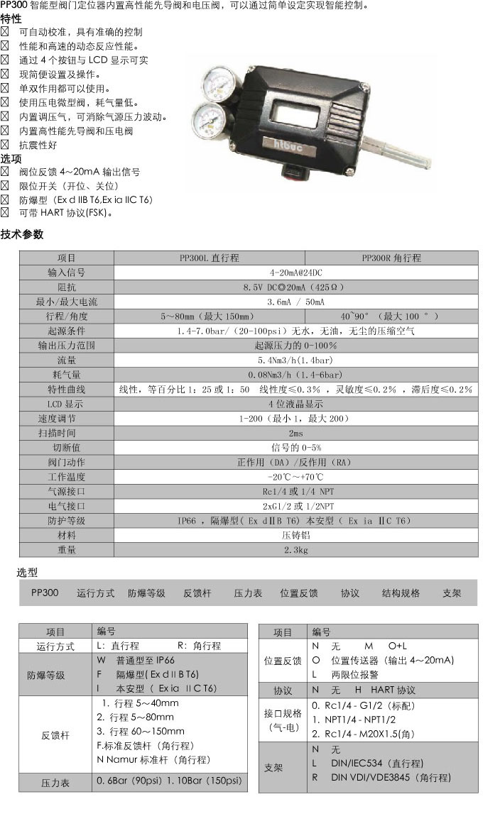 一、PP300智能型閥門定位器產品描述: PP300系列包括PP300L(直行程)和PP300R(角行程)定位器。PP300系列智能型閥門定位器通過接受控制系統發出的4~20mA電流信號,精確控制閥門開度的裝置。采用壓電微型閥,內置微處理器,可自動設定?蓭ART協議與系統有機的集成,連續的設備監控、適時的設備診斷和多變量的過程信息。 二、PP300智能型閥門定位器特點準確的控制性能,高速的動態反應性能一鍵自動校準,設定操作簡便單雙作用通用,正反作用設置方便采用壓電微型閥,耗氣量小可據執行器或安裝情況,選擇工作模式可在小型執行器上無振蕩工作結構堅固,抗沖擊、振動性能高帶液晶顯示(非防爆)可位置傳送或限位報警可帶HART協議